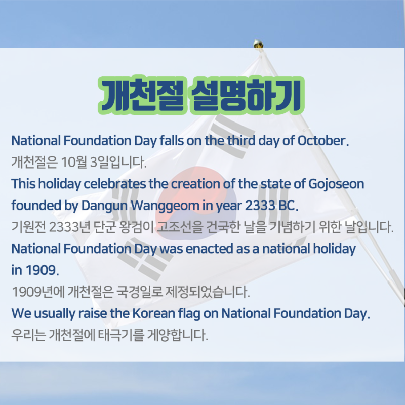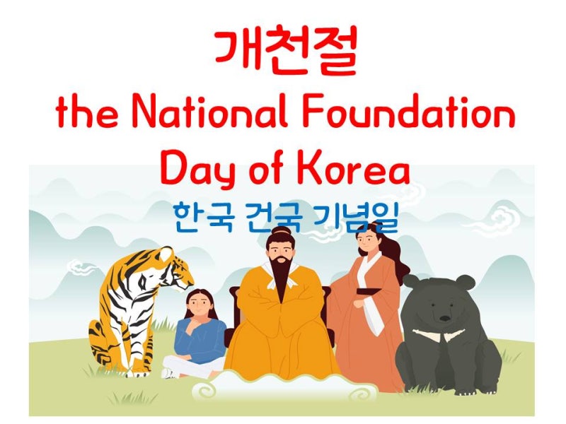The National foundation Day of Korea. 개천절 영어로 the National foundation Day of Korea 랍니다. 개천절 영어로 개천절 관련 영어표현모음 안녕하세요 여러분.